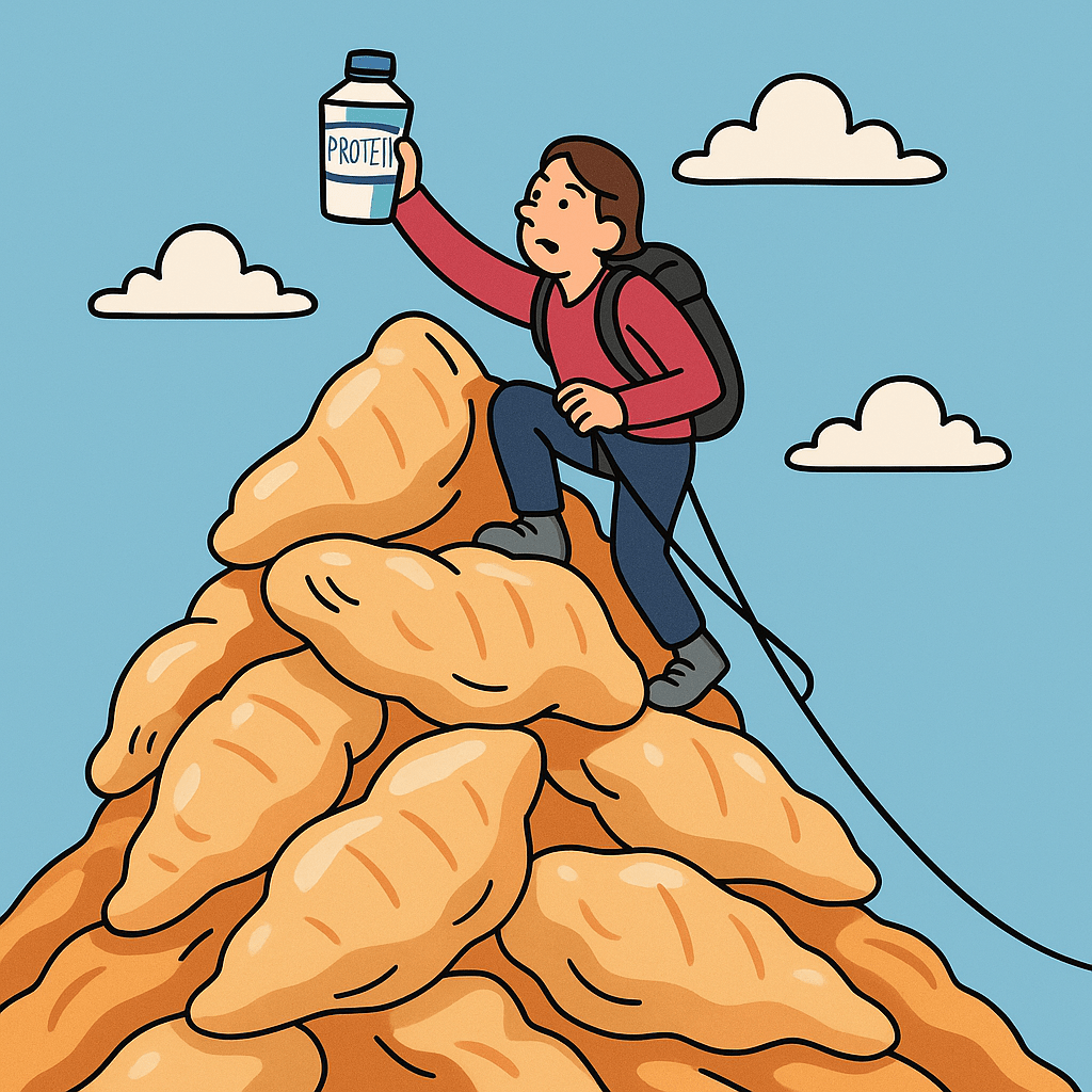 Except… uh oh. Your daily protein goal now looks like Mount Everest, and you’re standing at the bottom holding a single hard‑boiled egg like it’s an ice pick.